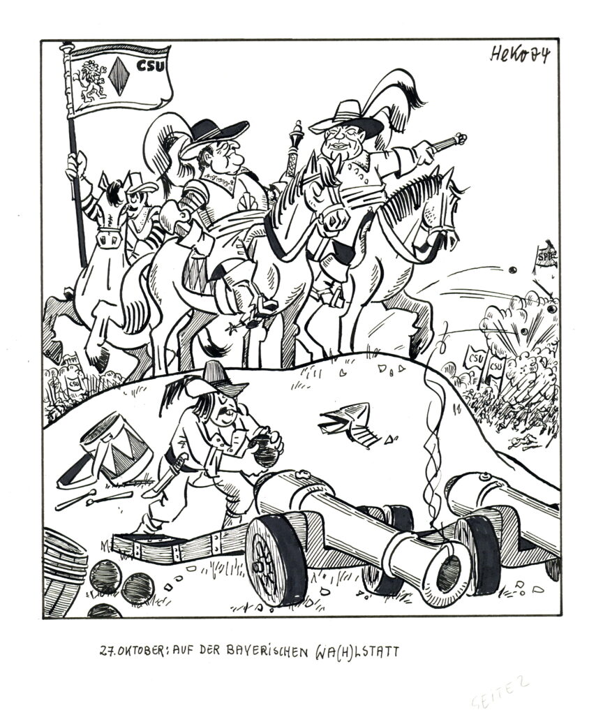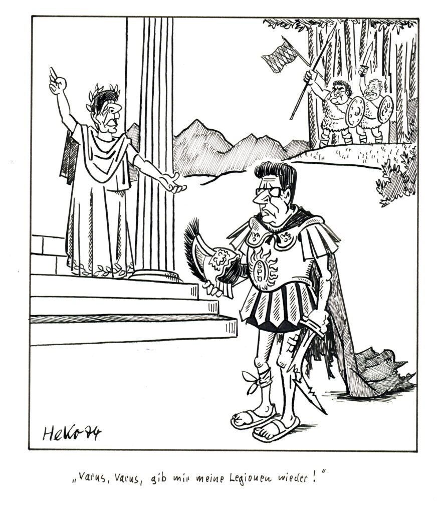 „Varus, Varus, gib mir meine Legionen wieder!“ – Der Chef der bayerischen SPD, Hans-Jochen Vogel, nach der bayerischen Landtagswahl 1974 mit Stimmverlusten (oben: siegreiche A. Goppel und F. J. Strauß)