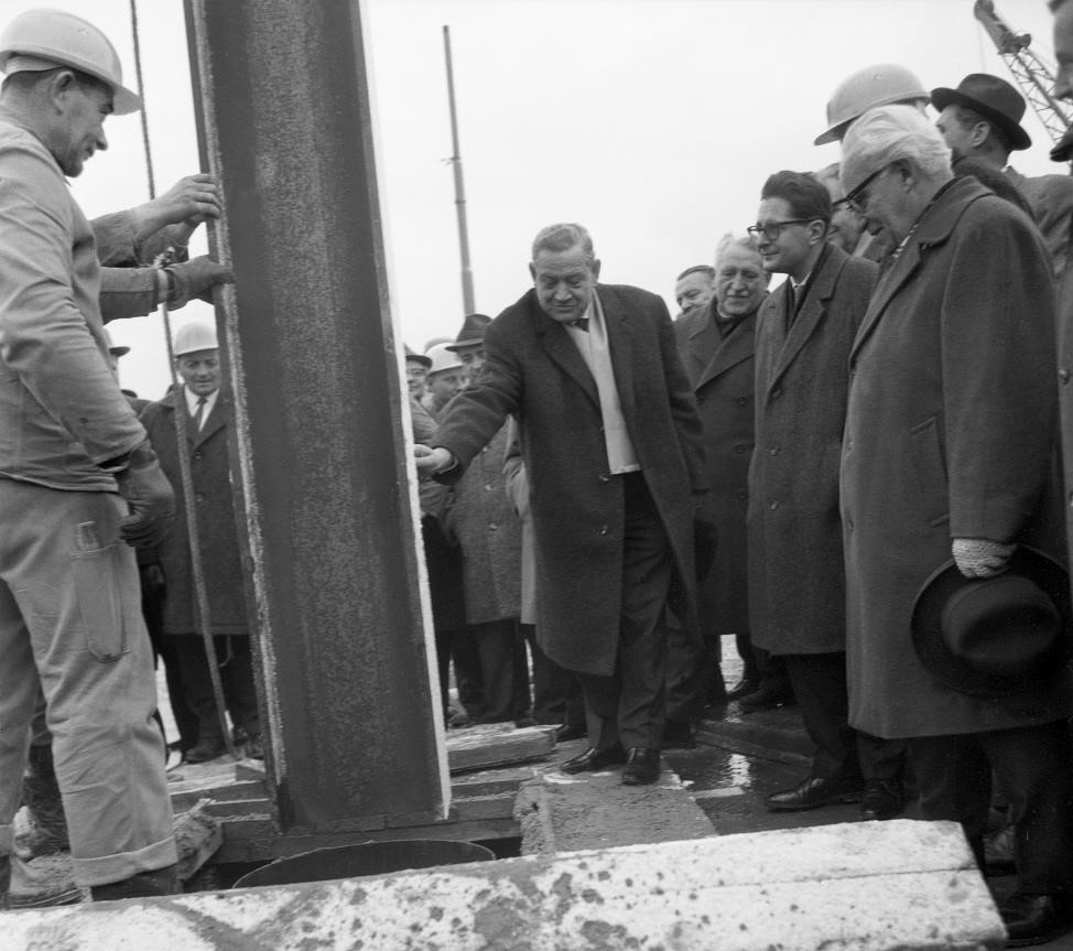 Erster Pfeilerbau der Münchner U-Bahn am 1. Februar 1965, mit Ministerpräsident Alfons Goppel und Münchens OB Hans-Jochen Vogel